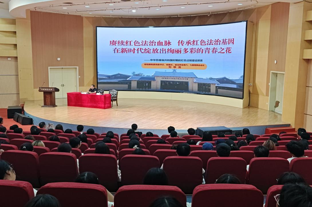 刘铁流同志以“赓续红色法治血脉 传承红色法治基因 在新时代绽放出绚丽多彩的青春之花——中华苏维埃共和国时期的红色法制建设探索”为题,以其深厚的理论功底和丰富的实践经验,从主要成就、历史地位、时代价值等三个方面,深入浅出地讲述了中华苏维埃共和国法制建设的伟大历程和艰辛探索。通过一张张珍贵的老照片、一组组难得的数据、一个个鲜活的历史案例,向同学们生动展现了中华苏维埃共和国法制建设从奠基(创建了较为完备的苏维埃法律体系)、突破(建立了较为系统的司法组织体系)、到培元(培养了一支苏维埃司法干部队伍)、再到实践(开展了丰富多彩的法制建设探索)的伟大成就。结合长期的红色法治研究与实践,特别是中华苏维埃共和国法制建设纪念馆筹建过程中积累的大量一手资料和实践经验,刘铁流同志深切指出,中华苏维埃共和国时期的法制建设,是中国共产党人治国理政的重要预演,是马克思主义法制思想中国化的时代先河,是中国优秀传统法律文化的传承发展,是中国共产党领导依法治国的伟大开端,在坚持党的领导、密切联系群众、坚守公平正义、坚持实事求是等方面具有重要的时代价值,为赓续红色法治血脉、传承红色法治基因提供了智慧和力量,为同学们坚定中国特色社会主义法治自信注入了信心。