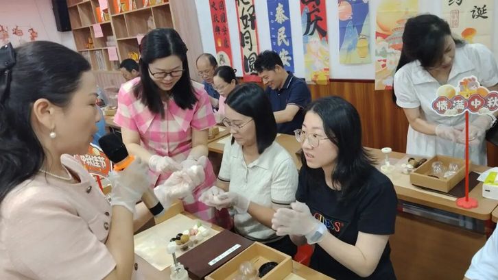 在DIY桃山皮月饼环节,老师们围坐长桌,一边聆听工作人员介绍桃山皮月饼的历史渊源,一边在专业指导下沉浸式体验月饼制作——从细心揉制饼皮、精心搭配馅料,到用雕花模具轻轻压实,一个个精致月饼在欢声笑语中成型,大家在动手实践里切实触摸到中华传统饮食文化的精髓。
