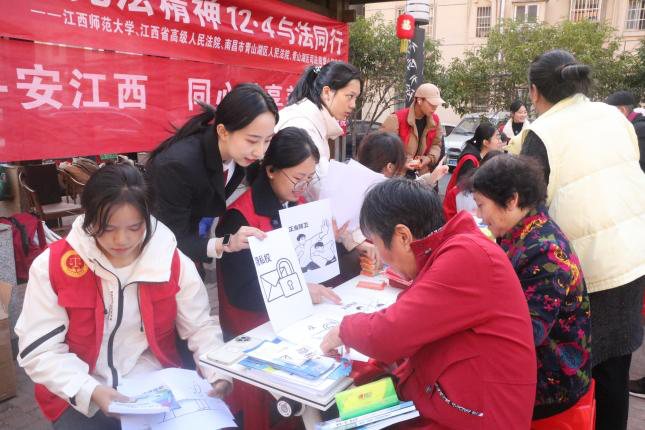 “法者,天下之公器也。”为让宪法精神真正扎根基层、浸润人心,学校将普法阵地延伸到校园、寝室、社区:志愿者们走进南昌市田家炳学校,创新采用“案例分析+法律普及+自我防范”三维授课的模式讲解成年安全、校园欺凌和线上“软暴力”等热点;走进校园寝室,通过张贴海报、发放手册,精准解答同学们生活中的法律疑问;走进塘山镇谢家村社区,设普法咨询台、发放宣传资料,在轻松互动中切实增强了居民的法治意识与参与热情。